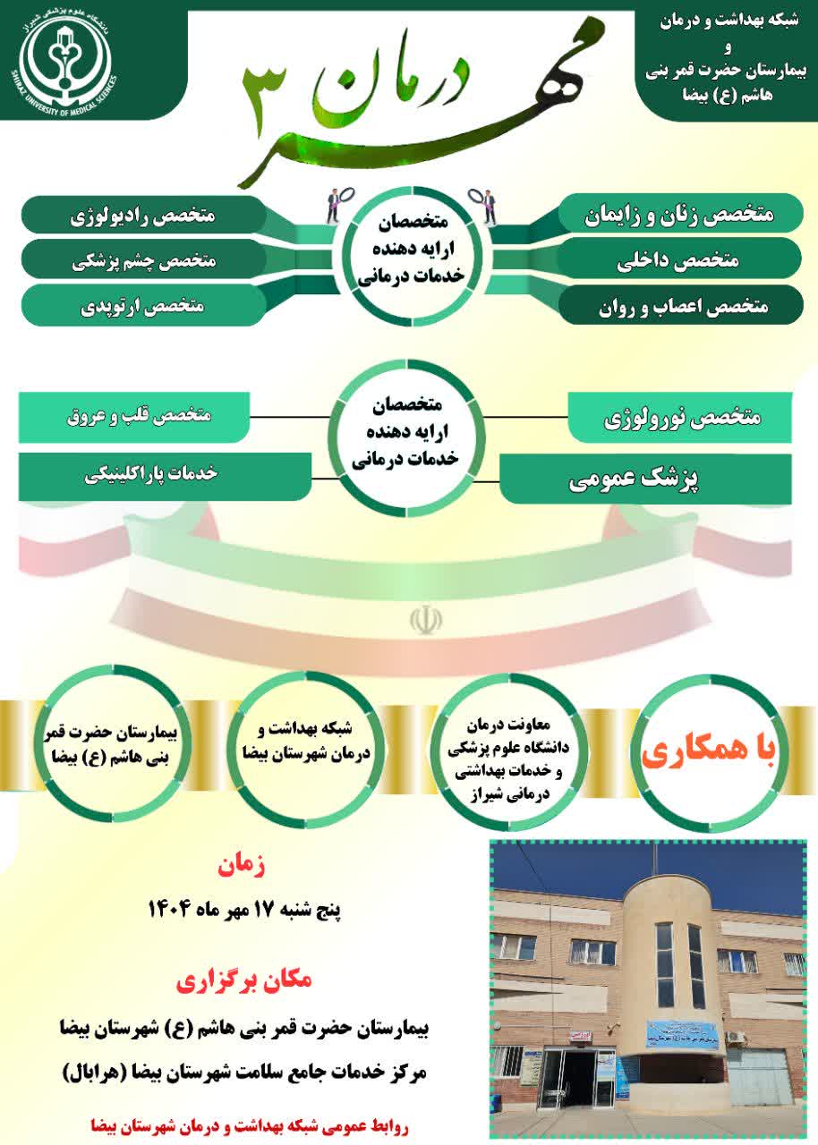 به گزارش روابط عمومی شبکه بهداشت و درمان شهرستان بیضا، رییس شبکه بهداشت و درمان شهرستان بیضا گفت: در این نشست، آخرین تمهیدات لازم برای اجرای مرحله سوم طرح مهر درمان مورد بررسی قرار گرفت. دکتر «محمد یاسین صمیمی» ضمن تاکید بر اهمیت اجرای دقیق و منظم این طرح، ادامه داد: هدف اصلی مهر درمان، ارتقای سطح سلامت جامعه و تسهیل دسترسی مردم، به‌ویژه در مناطق کم‌برخوردار، به خدمات تخصصی و فوق‌تخصصی است.